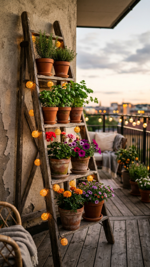 An old wooden ladder leaned against the balcony wall and loaded with a mix of herb pots and flowering annuals is one of those quick DIY balcony arrangements that takes 20 minutes to set up, looks like it took hours, and earns more compliments than almost any other approach.