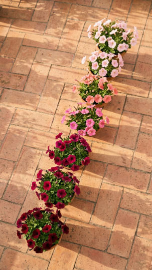 The ombre plant arrangement — same container style, same plant type, graduated colors from deep to pale — is a design concept so simple and so visually effective that it’s almost unfair how good it looks. Seven terracotta pots, seven petunia shades from deep burgundy through wine, rose, and blush to the palest barely-pink — arranged in a diagonal line across the balcony floor.