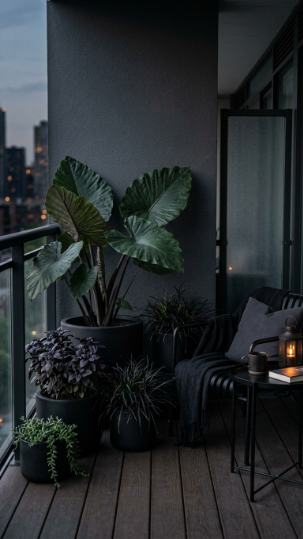 For the design-forward balcony owner who wants something genuinely unlike anything else in the neighborhood, a black and deep green arrangement is strikingly dramatic and sophisticated. Matte black ceramic pots, black-stemmed elephant ears, deep burgundy-black basil, and dark ornamental grasses create a moody, editorial aesthetic that belongs in a design magazine.