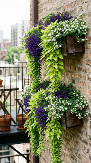 Stacked window boxes at two different heights — one row at railing level, one row above it at eye height — with dramatically trailing plants spilling downward in long cascading curtains creates one of the most visually spectacular quick DIY balcony arrangements possible.