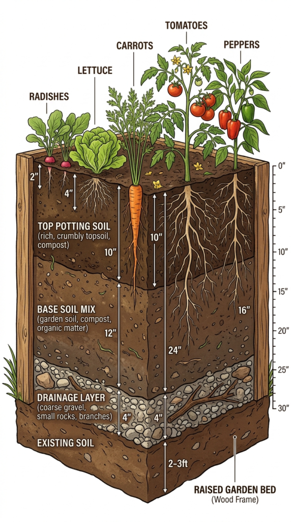 If your raised bed sits on healthy, loose garden soil, your plant roots can actually grow down through the bed floor and access the native soil below. This effectively gives you bonus depth for free! In this case, you can sometimes get away with a slightly shallower bed than the charts suggest.
