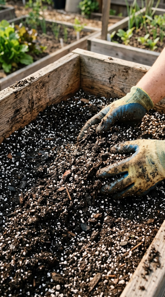 💡 Pro Tip: Never use straight garden soil or topsoil alone in a raised bed — it compacts over time and suffocates roots. Always blend in compost and a drainage material like perlite or coarse sand.