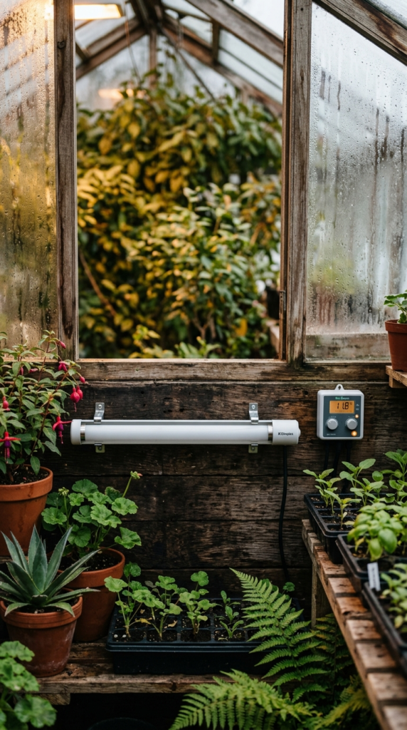 Electric tubular heaters are the most practical choice for a small greenhouse — they’re inexpensive to buy, precisely controllable with a thermostat (set to 5°C for frost-free overwintering, 10°C for tender plant protection, 15°C for year-round growing), and safe to leave unattended. Install them low on the wall (heat rises naturally through the growing space) and use a separate thermostat probe rather than relying on the built-in thermostat for accurate temperature control.