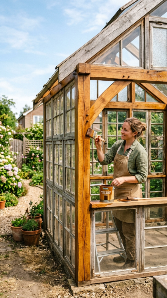 Exterior wood stain in a medium or dark tone (oak, cedar, dark oak, or dark green all work beautifully on a reclaimed window greenhouse) provides both UV protection and moisture resistance, and gives your structure a cohesive, finished appearance that unifies the mix of reclaimed window frames and new structural timber.
