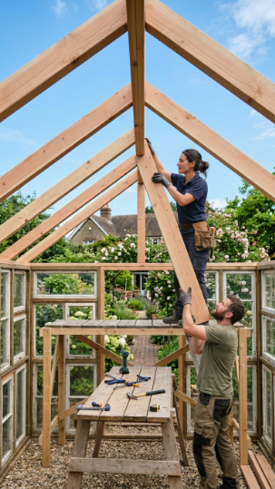 Explore our building the roof for a reclaimed window greenhouse — apex and lean-to guide for rafter calculations, ridge board fixing, and polycarbonate glazing installation.