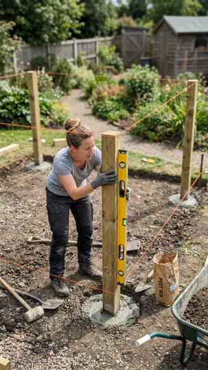 🖼️ IMAGE PROMPT: A realistic wide lifestyle DIY photo of a person setting a treated timber corner post in a hole with post mix concrete, using a spirit level to check plumb on two faces simultaneously, with other corner posts already set and string lines running between them defining the greenhouse frame. Bright natural daylight. Color palette of natural timber