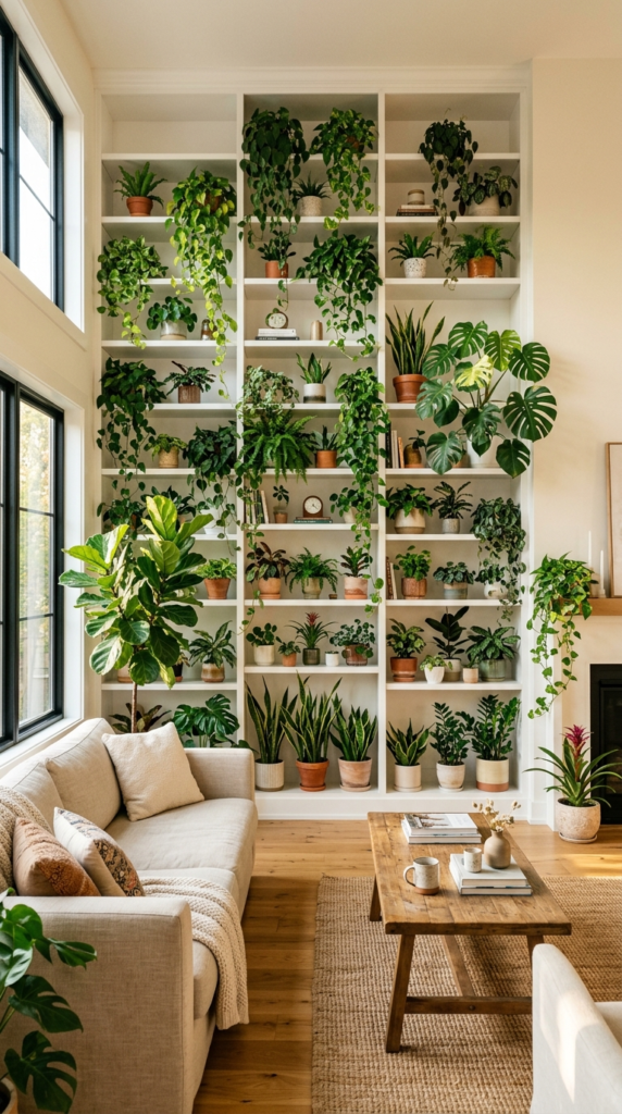 Floor-to-ceiling shelving units The most dramatic and impactful option. Full-height built-in shelving running from floor to ceiling creates an instant feature wall and allows you to create a genuine gradient of plant types — sun-lovers near grow lights at the top, shade-tolerant beauties at the bottom. The visual scale is unmatched by any other approach.