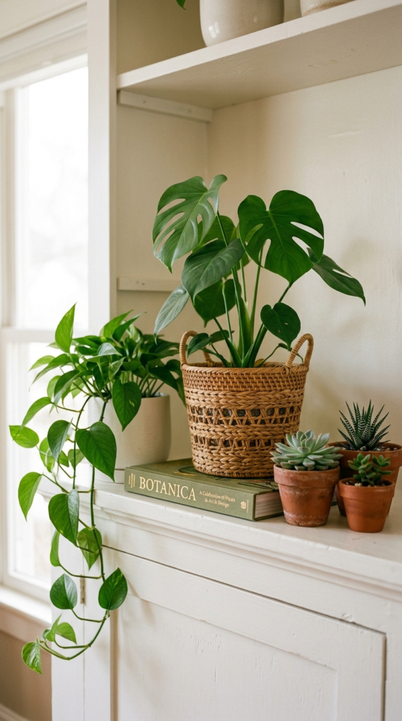 Add non-plant objects sparingly — a single stack of beautiful books, a small sculpture, or a decorative candle holder gives the eye a rest between plant groupings and prevents the display from feeling overwhelming.