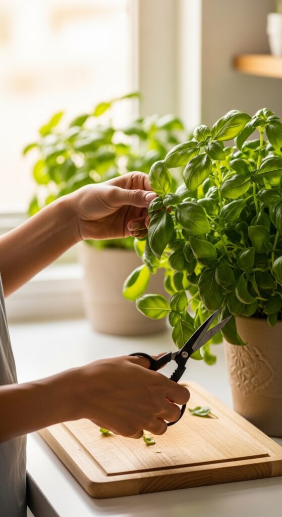 The key is to never harvest more than one-third of the plant at once, and always cut stems just above a leaf node (the point where leaves branch from the stem). This encourages the plant to produce two new stems where you cut, making it bushier and more productive over time. For basil specifically, always pinch off flower buds as soon as they appear — once basil flowers, the leaves lose flavor and the plant declines rapidly.