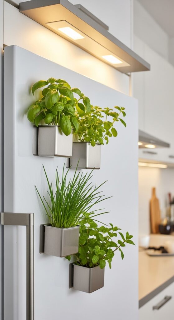 This is one of those indoor herb garden ideas for kitchen spaces that makes people do a double-take — in the best possible way. Magnetic herb planters attach directly to the side of your refrigerator, turning completely unused vertical space into a productive little herb garden.