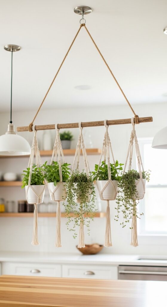 The simplest version is a wooden dowel or copper pipe hung from ceiling hooks with macramé or leather cord, from which small pots hang at varying heights. It looks absolutely stunning above a kitchen island or dining table — like living art that you can also cook with.