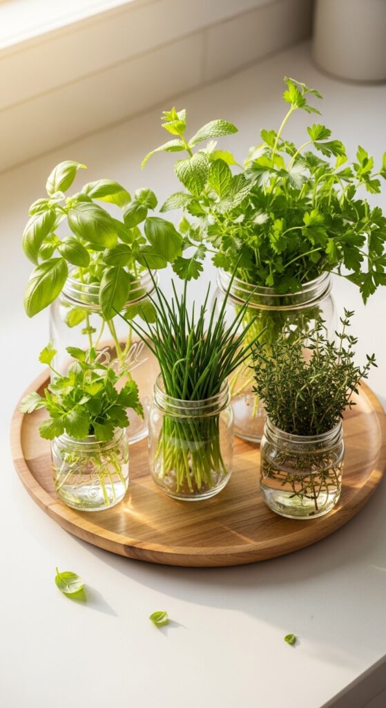 The easiest starting point is a simple windowsill setup with three to four pots of the most forgiving herbs: mint, chives, parsley, and basil. These four herbs cover an enormous range of cooking uses, tolerate typical kitchen conditions well, and are incredibly rewarding for beginners. A mason jar collection on a tray or a small tiered stand near your best window are both equally beginner-friendly options that require minimal setup and maintenance.