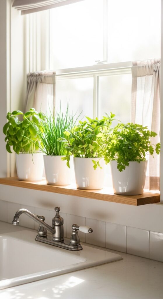 If your kitchen has a window above the sink — and so many do — you are sitting on prime herb-growing real estate that most people waste completely. A slim shelf mounted just below or alongside that window gives you the brightest, most naturally lit spot in the kitchen for your herb garden.