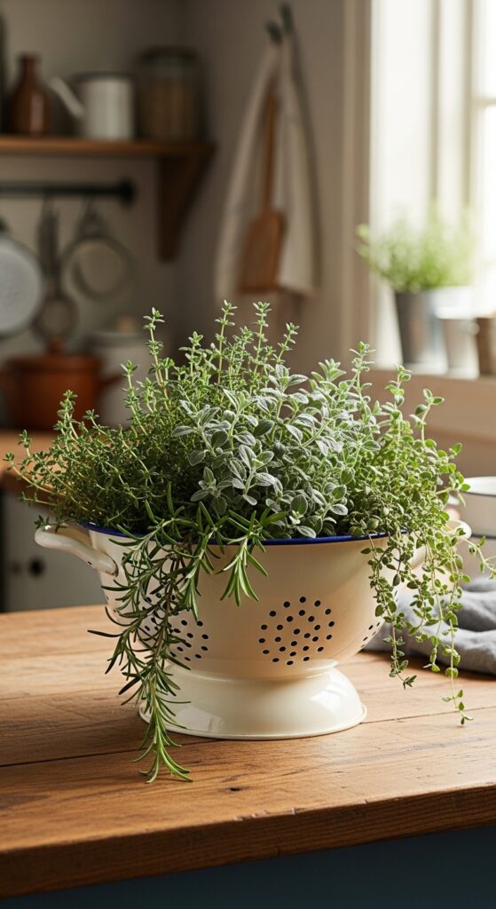 This approach is also completely budget-friendly — raid thrift stores, flea markets, and your own kitchen cupboards for forgotten items that could become your most beautiful herb planters. A $2 thrift store colander filled with fresh herbs is genuinely stunning.