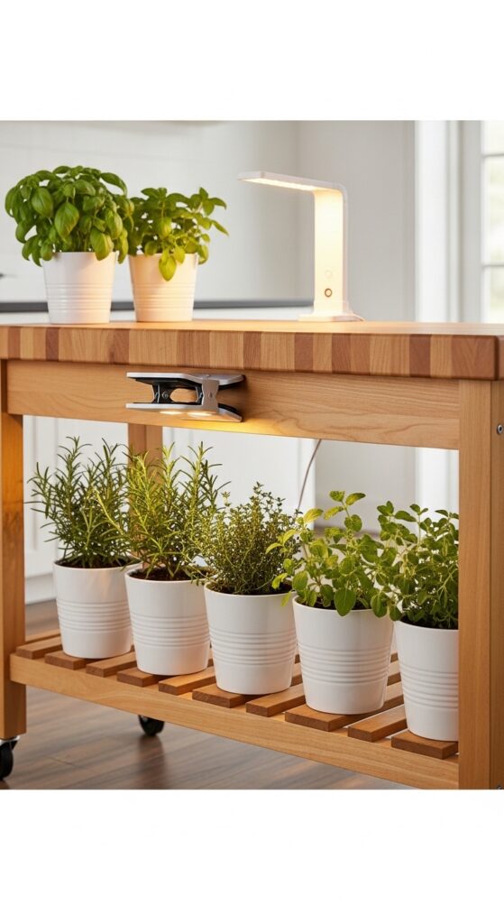 💡 Pro Tip: Attach a small LED grow light bar to the underside of the island’s top surface, pointing down at your herb shelf. This creates a dedicated grow station that works beautifully day and night, keeping your herbs thriving even in a kitchen with limited natural light.