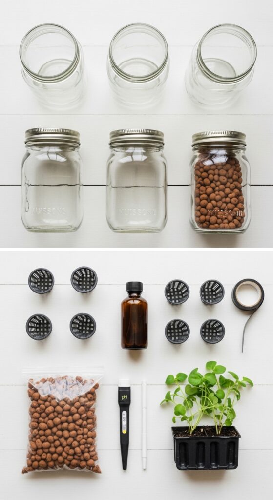 - You need only a few inexpensive supplies — mason jars, net cups, a growing medium like clay pebbles, and hydroponic nutrients — to build a fully functional system for under $30.
