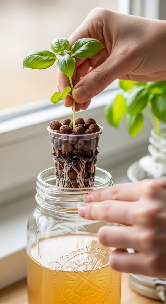 Herb cuttings work beautifully too — and they’re completely free if you already have herbs growing. Snip a 4–6 inch stem, strip the lower leaves, and place it directly in the net cup with clay pebbles. Give it a week or two and it’ll develop roots right in the nutrient solution. This is how most experienced hydroponic growers propagate mint, basil, and rosemary.