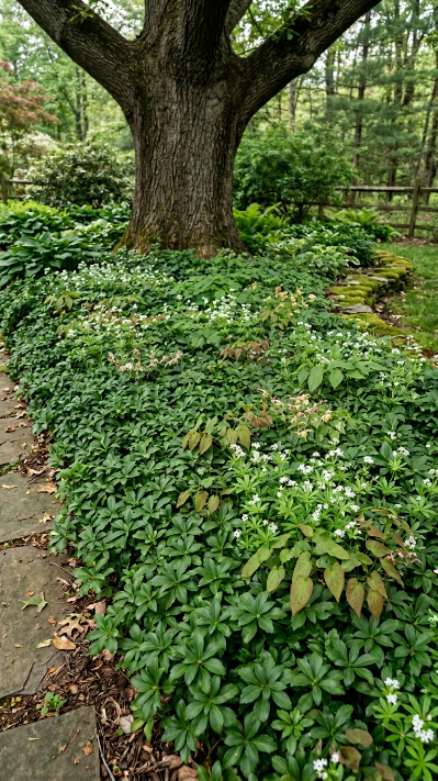 - Pachysandra — The classic choice for deep shade. Evergreen, dense, and completely reliable. Plant it once and forget it.