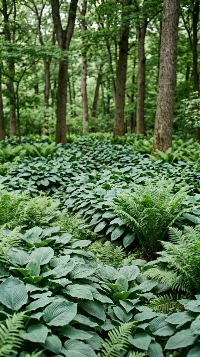 - Hostas — The undisputed kings of shade. Enormous variety of sizes and colors, virtually pest-free (except slugs), need dividing only every 4–5 years. Plant large varieties for maximum weed-suppression from their own footprint.