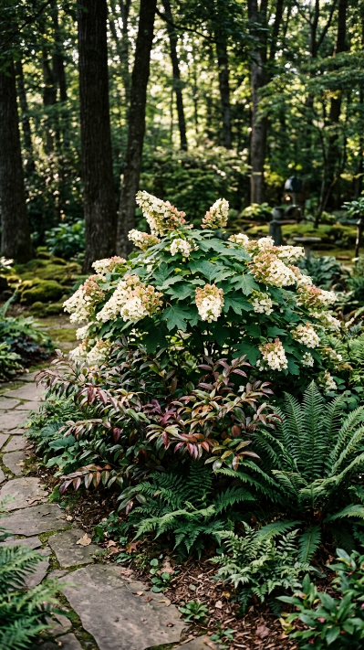 - Shade-tolerant shrubs like oakleaf hydrangea, leucothoe, and Japanese forest grass act as permanent anchors that need virtually no attention after their first establishment year.