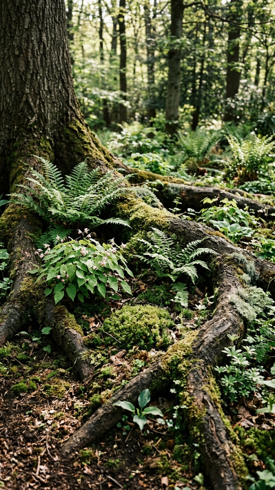 - Ferns (especially native wood ferns) — Fibrous, shallow roots slot between tree roots beautifully