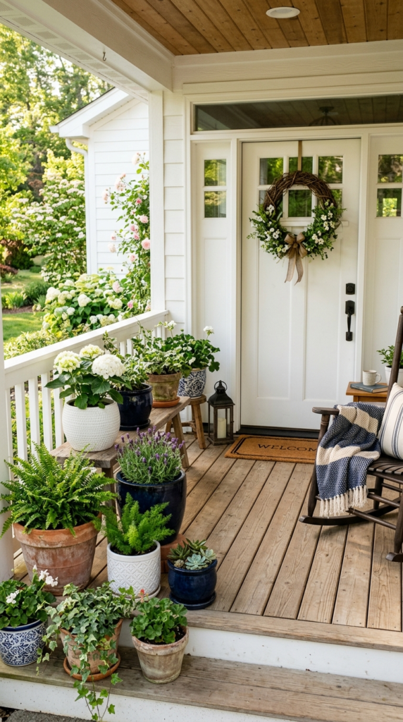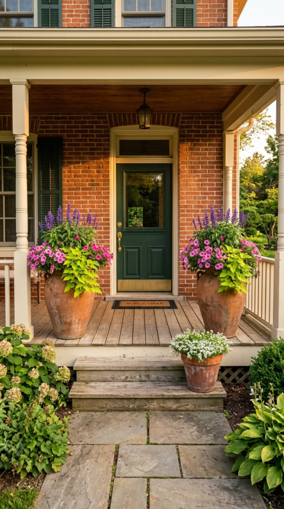 Coordinate with your front door color too! If you have a red door, lean into whites and soft pinks rather than competing reds. A navy door? Pop it with bright yellows and oranges. The front porch should feel like a whole picture, not just a collection of random plants.