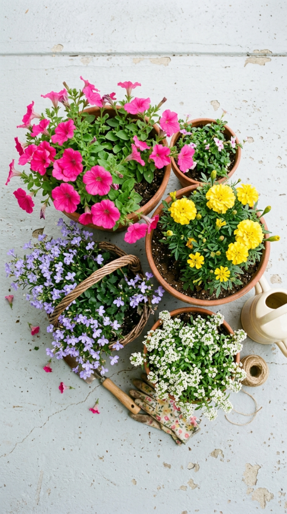 - Repeat colors — use at least one plant color that appears in multiple containers to tie everything together