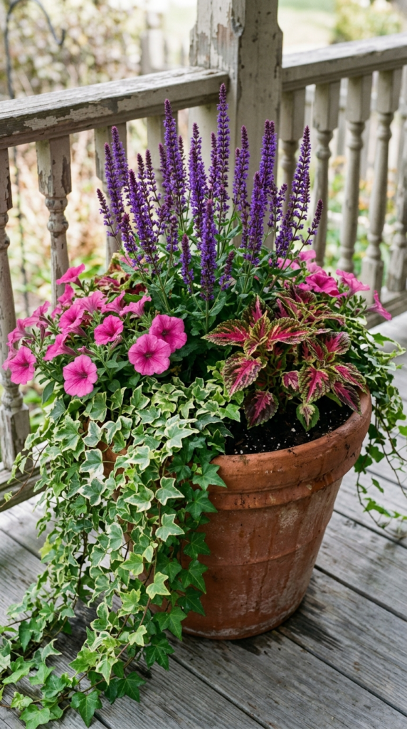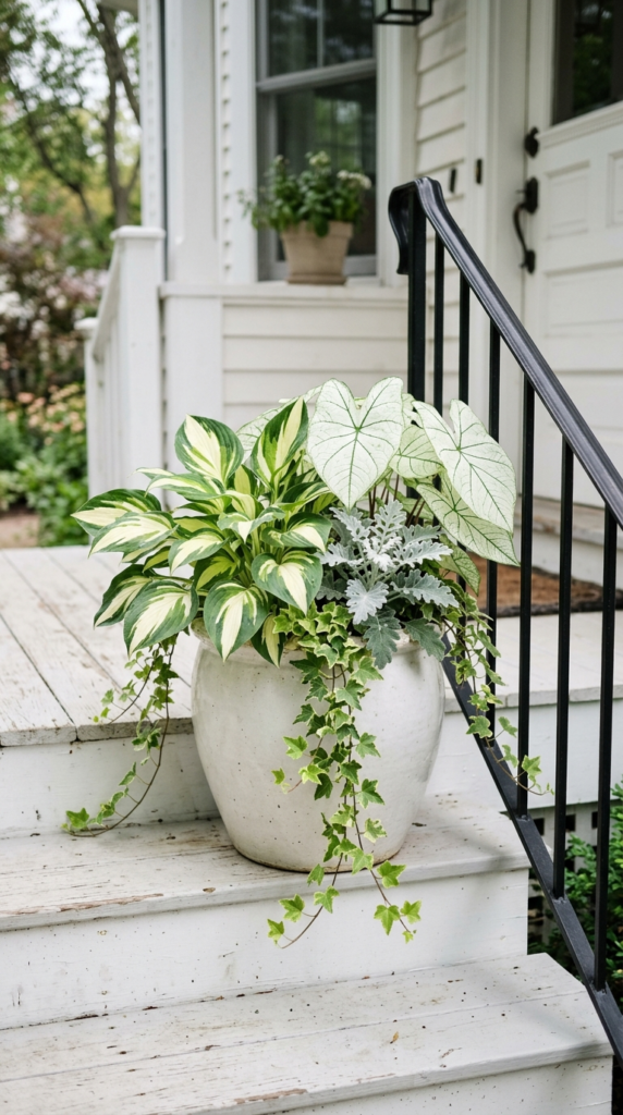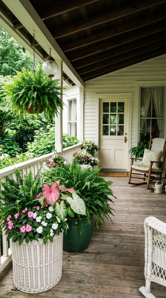 - Caladium + fern + trailing ivy — a classic shaded porch winner with white, green, and deep emerald tones