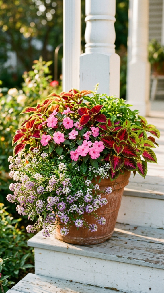 - Impatiens — the MVP of shade containers, blooms non-stop in almost zero sun