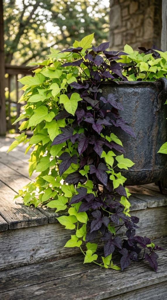 Talk about a game-changer! Sweet potato vine alone can transform even the most boring container — it grows fast, fills gaps, and creates that magazine-worthy overflow that looks like you really know what you’re doing.