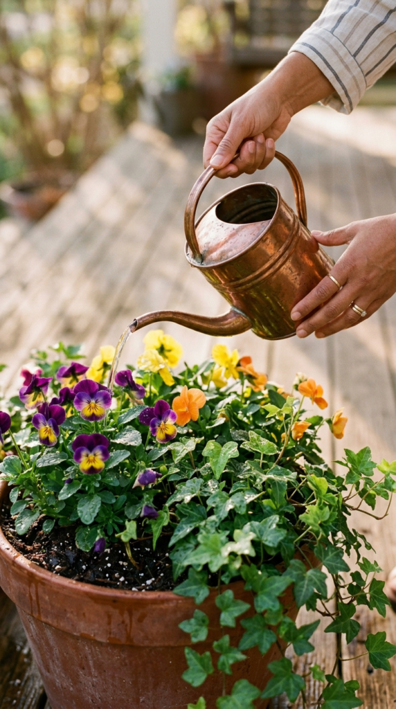 Add a liquid fertilizer boost every 2–3 weeks once plants are actively growing — a balanced 10-10-10 fertilizer or a bloom-boosting formula works brilliantly for flowering containers.
