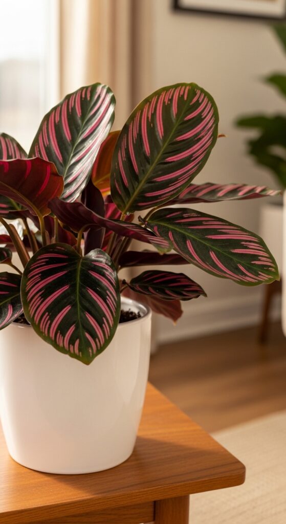 • Calathea ornata: Pink pinstripes on dark green — dramatic and elegant