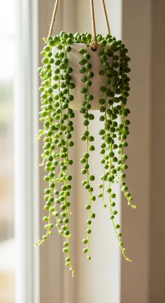 Each strand is made up of perfectly round, pea-sized bead leaves that store water like tiny green spheres. The cascading effect of long, bead-covered strands hanging from a shelf or hanging planter is simultaneously delicate and dramatic — one of those rare plants that looks impossibly perfect even on a bad day.