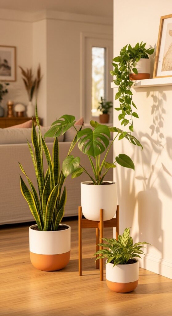 There’s no fixed number, but odd numbers grouped at varying heights always look more intentional than even numbers in rows. Start with a statement floor plant, add a medium-height plant on a stand, and bring in a trailing plant on a shelf — that trio covers the visual field from floor to ceiling and creates a genuinely designed feel. From there, add more or fewer plants based on the room’s size and your personal preference.