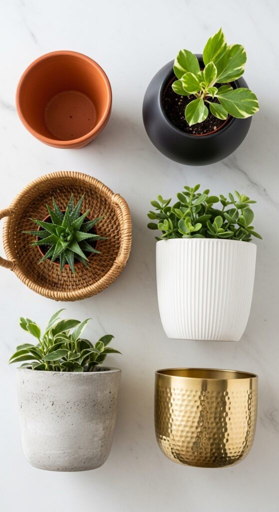 Match your pot material to your interior style — terracotta and rattan for boho and Mediterranean spaces; matte black or concrete for modern and industrial rooms; white ribbed ceramic for Scandinavian and minimalist aesthetics; hammered brass or copper for maximalist and glam interiors. The right pot instantly elevates the plant and ties it into the room’s design language.