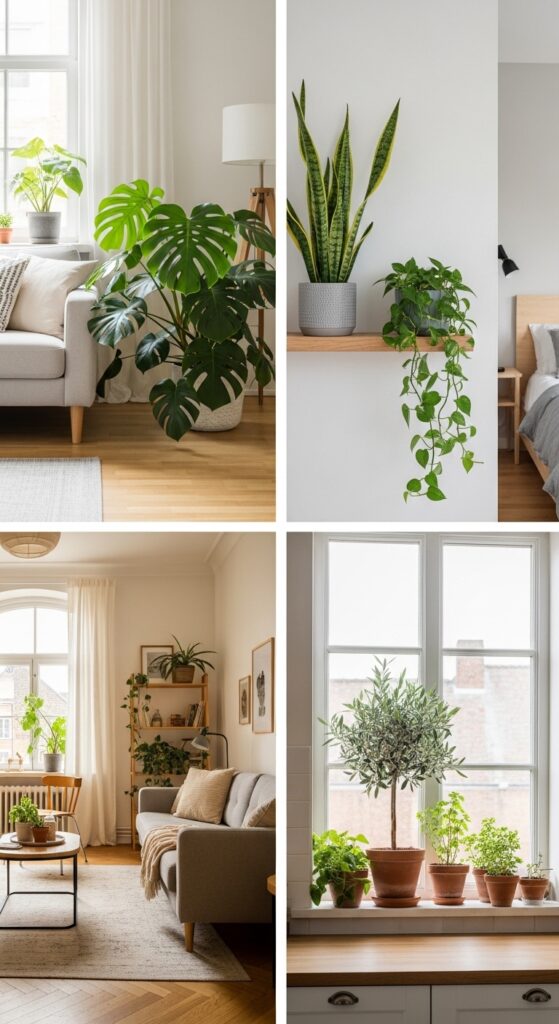 Hallways and entryways are transformed by tall, narrow plants that make a strong first impression without taking floor space — snake plants, slim dracaenas, and a single dramatic peace lily all work brilliantly in these transitional spaces.