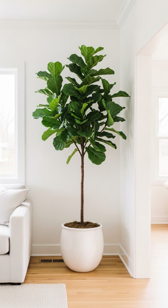 A single large fiddle leaf in a statement pot commands an entire room. Position it in a bright corner near a window — ideally a south or east-facing one — and it becomes an instant focal point that ties together your whole design scheme. It works equally brilliantly in modern, Scandinavian, boho, and classic interior styles.