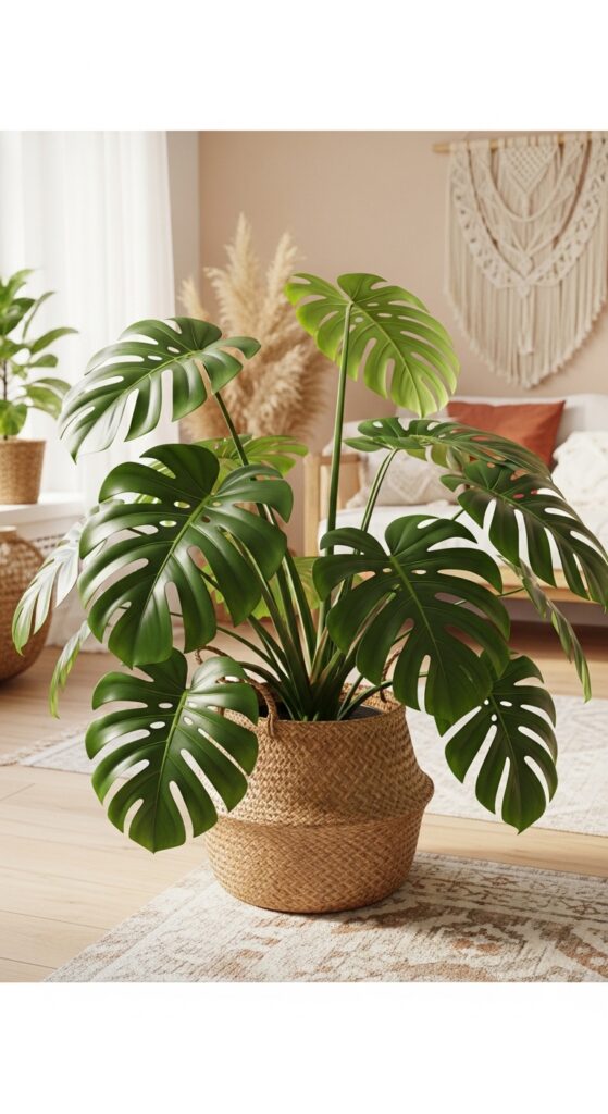 Monstera is endlessly adaptable to different interior styles. In a boho space, it sits in a woven rattan basket and looks completely at home. In a modern minimalist room, it goes into a sleek black or concrete pot and becomes a bold graphic element. It’s that rare plant that genuinely works with almost any aesthetic.