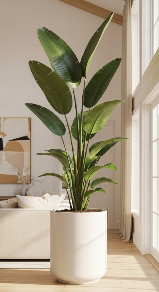 Those enormous, paddle-shaped leaves fan out in a spectacular upright form that’s unlike any other houseplant. The sheer scale and drama of a mature bird of paradise in a large contemporary room is genuinely breathtaking — it fills vertical space in a way that makes even standard ceiling heights feel grander.