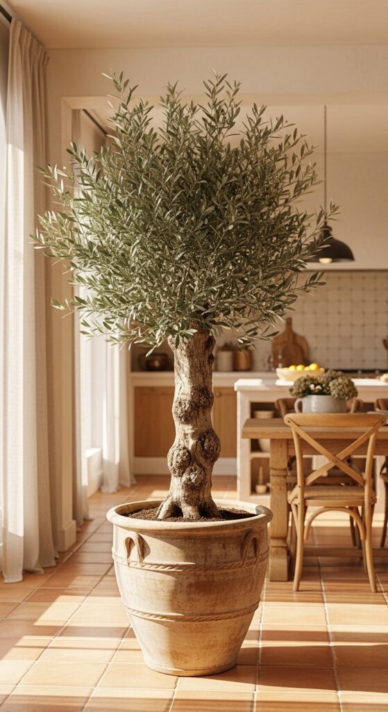Olive trees suit Mediterranean, Tuscan, modern farmhouse, and minimalist interior aesthetics with particular brilliance. In a white kitchen with terracotta tile, an olive tree in an aged pot is simply perfection. In a Scandinavian living room with clean lines and neutral tones, it adds warmth and organic texture that no other plant quite achieves.