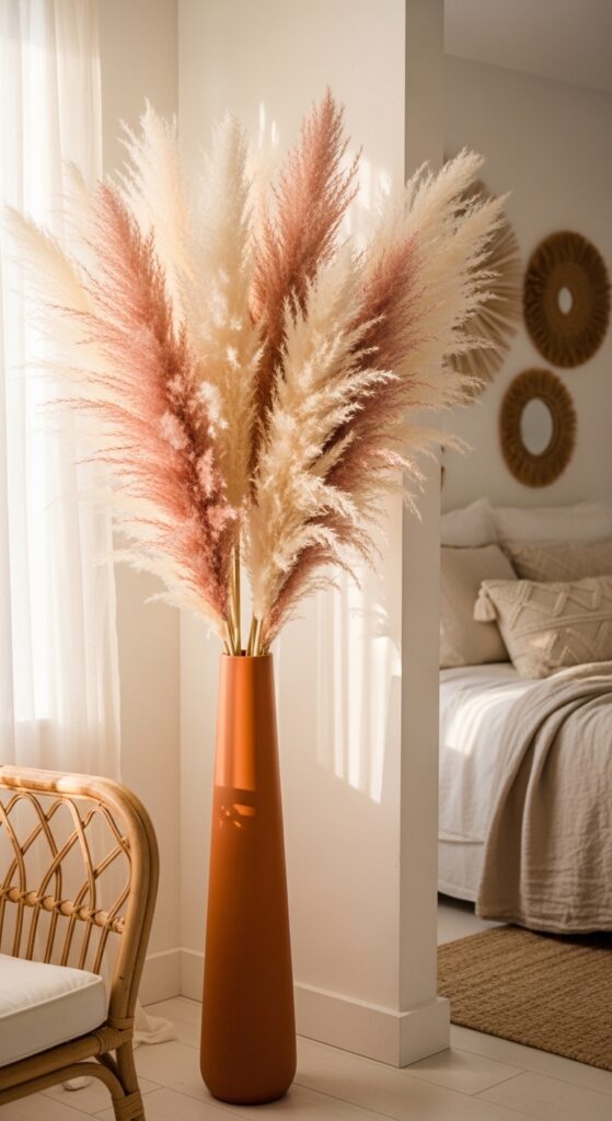 The magnificent fluffy plumes in cream, blush, natural, or even dyed tones create a sculptural quality that no other plant or decor element quite replicates. A single large arrangement in the corner of a bedroom or living room instantly transforms the room’s atmosphere — softer, warmer, and more curated.