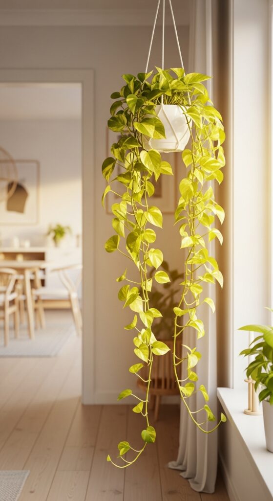 The golden pothos variety (Epipremnum aureum) with its heart-shaped green-and-yellow variegated leaves is the classic choice — the yellow streaks catch light beautifully and warm up any room they’re in. The ‘Marble Queen’ variety with cream-and-green marbling has a more sophisticated, softer look, while the ‘Neon’ variety in lime green is electric and eye-catching.