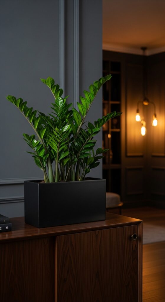 It suits dark, dramatic interior schemes with particular brilliance. Against charcoal walls, in a darkly furnished study, or on a credenza in a warmly lit hallway, the ZZ plant’s glossy presence is genuinely striking. It’s one of the few plants that actually looks better in moody, lower-light settings rather than worse.