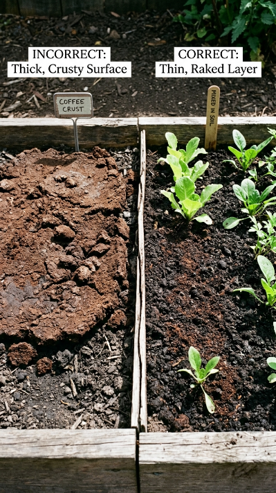 A thick layer of coffee grounds on the soil surface dries out and forms a water-repellent crust that prevents rain and irrigation from reaching your plant roots. This is the opposite of helpful. Always apply thinly and incorporate into the soil or mix with other mulch materials.