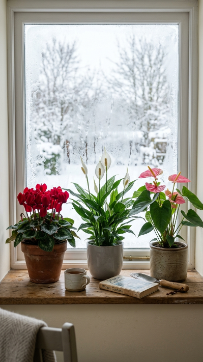 Tropical winter bloomers like anthurium and African violets have different needs — they flower in winter because your consistently warm, sheltered home mimics their tropical origin all year round. For these, the challenge is compensating for reduced light and dry heating-season air, not mimicking cool seasons.