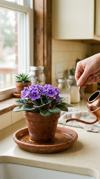 Never get water on African violet leaves — the fuzzy leaves are prone to spotting and rot when water sits on them in cool conditions. Always water from below by filling the saucer and allowing the pot to absorb upward, then discarding remaining water after 30 minutes.