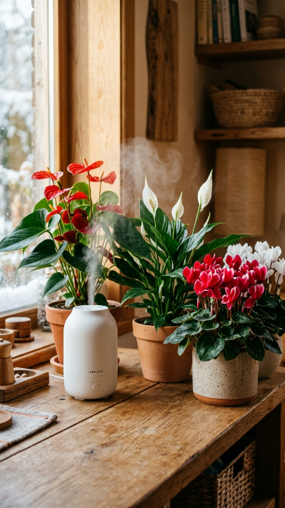 Ideal humidity for most winter flowering houseplants sits between 40–60%. Most heated homes in winter drop to 20–30% — way too dry for tropical bloomers like anthuriums, African violets, and peace lilies. A small ultrasonic humidifier near your plants is one of the most impactful things you can add to your winter plant care setup.
