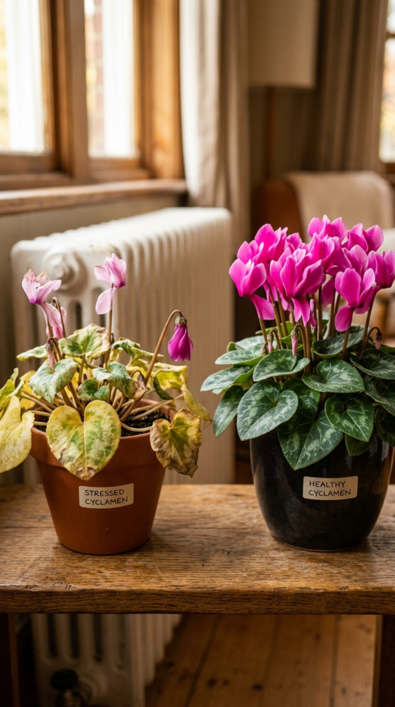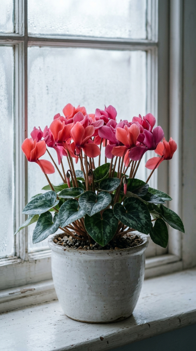 - Cyclamen: prefers 50–65°F (10–18°C) — cooler rooms are ideal!