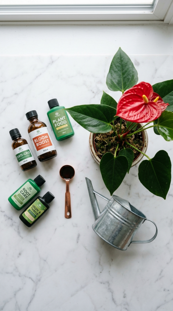 - Anthurium: balanced or high-phosphorus, monthly while blooming