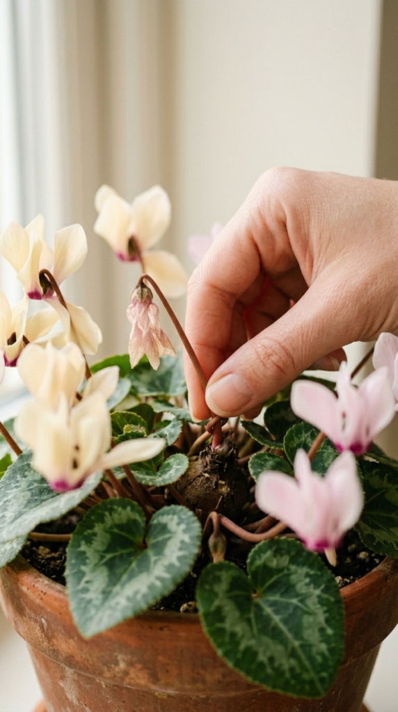 Deadhead cyclamen by grasping the spent flower stem at its base and giving it a firm twist-and-pull (not a cut) — this removes the entire stem cleanly without leaving a rotting stub. Do this every few days to keep new buds coming continuously.